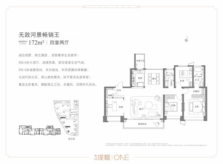 【项目简介】项目总占地约99.7亩,总建面约242973平方米,容积率约2.49,建筑密度约22%,绿地率约35%,总规划户数910户,住宅建筑面积约为172㎡-240㎡臻装观河大平层,臻稀席位,值此珍藏,全低纯粹社区,层高约为3.15米,超大窗墙比,精装修交付。
