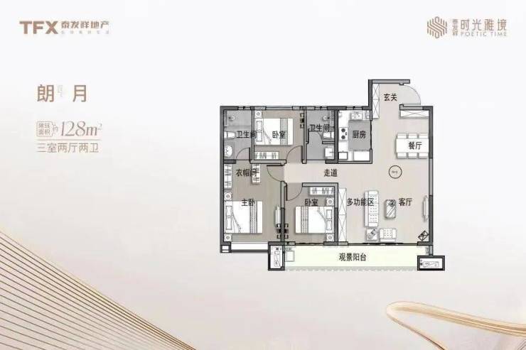 项目在户型设计上,也颇具匠心。项目约112㎡户型,是南北通透全明的经典三室格局;约128㎡户型是独立入户玄关,配有超大景观阳台,大开间主卧套的设计;约143㎡户型则是四面朝南,卧室在设计上兼顾了舒适性和私密性,并且兑现了奢享级的四室品质空间,都在日常使用与空间美感中,找到了奇妙的平衡点。