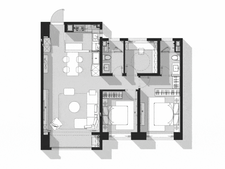 T2-143户型以三代同堂的居住状态为首要设计思考,大量的隐形橱柜与收纳,贴合多人口的现实需求,半开放式的厨房与客餐一体的设计让公共区域具有联动性,大面积的横窗具有较好的通风采光效果,借景入室打造自然之家,让每个家人都能在空间中寻找到最舒适的位置。