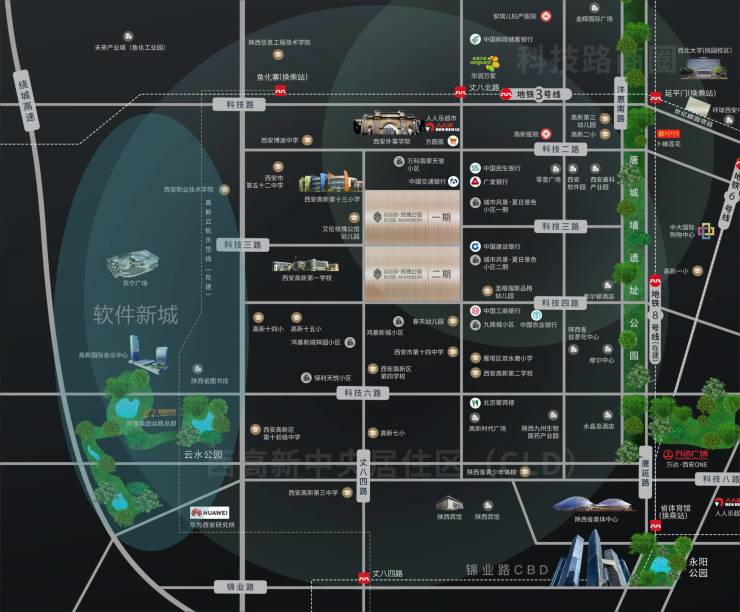 四、商业:地处高新路、唐延路以及锦业路三大商圈。地理位置优越,区域分布有万达ONE、世纪金花、金鹰国际购物中心等大型高档购物中心及华润万家、永辉超市等大型商超