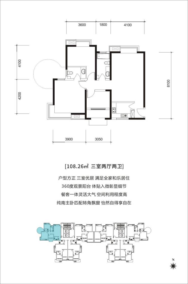 户型1.单套面积:108.26㎡—109.92㎡三室两厅两卫 共计:51套