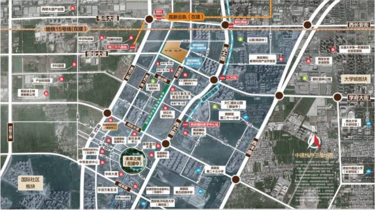 TOP轨交线三轨道聚集,多维立体路网环伺。项目接驳地铁6号线仁村站约600米,现已正式运营,地铁15号线祝村站(在建)约400米,高新云轨能源站(在建)约400米,以及西安南站(在建)等线路,同步城市繁华,悦享时代速度。