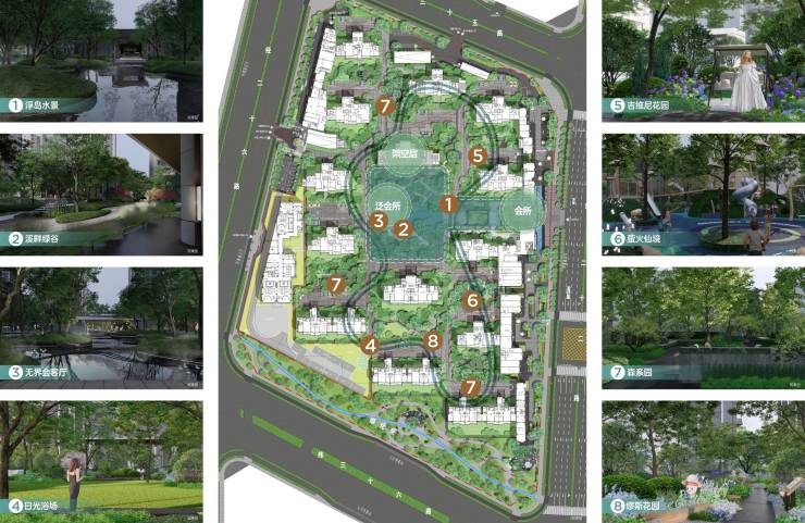 8/八大景观组团:浮岛水景、溪畔绿谷、无界会客厅、日光浴场、缪斯花园、萤火仙境、森系园、吉维尼花园