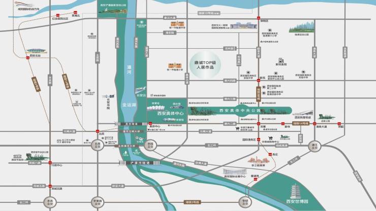 【配套篇】-交通3、14号线双地铁环绕,通达机场、西安北站、高新区及主城各区。奥体大道、港务大道等城市干道近邻,链接全城