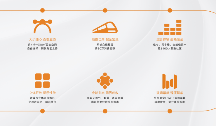 【地铁枢纽 微城市商业】人潮铺?周边2公里内汇聚超30万客流,项目社区自带超6400位业主,24h多元客群钻石铺?双铁口岸,总部产业生态圈,品牌央企匠筑,无忧品质交付全能铺?建筑面积约4-318㎡灵动空间,满足全能业态经营需求