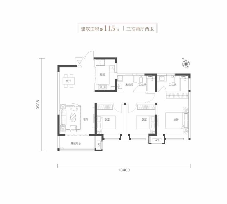 宽境横厅|双卧套房|全明三卫|餐厨一体|家政空间