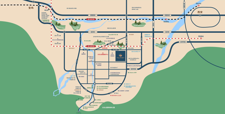 太白山、红河谷、周公庙、法门寺……大关中旅游环线,沿路美景无数,随时随地,说走就走!项目隔路相望城际铁路太白山站,半小时即可通达 西安。沿线法门寺、重阳宫、楼观台、红河谷等大 关中南向风光沿路尽收眼底,政府重点发展文化旅 游线路,全域化旅游时代带中大关中旅游发展