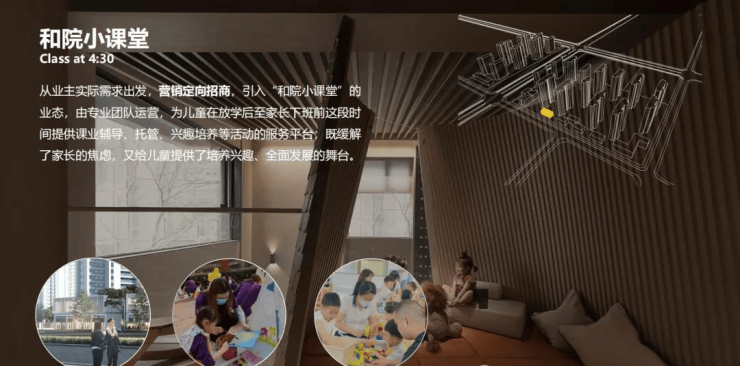 从业主实际需求出发,营销定向招商,引入“和院小课堂”的业态,由专业团队运营,为儿童在放学后至家长下班前这段时间提供课业辅导、托管、兴趣培养等活动的服务平台。