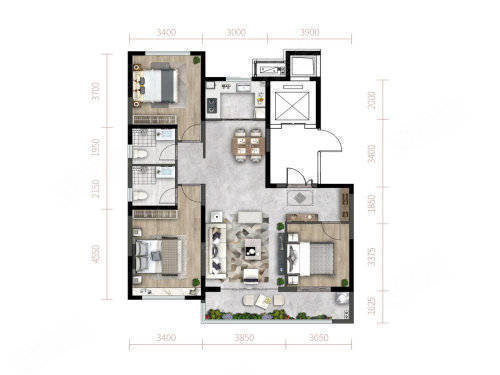A户型:3室2厅2卫1厨, 建面118.00平米。