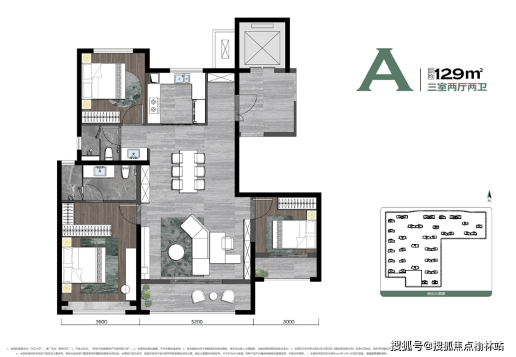 【A户型】建面约129㎡三室两厅两卫