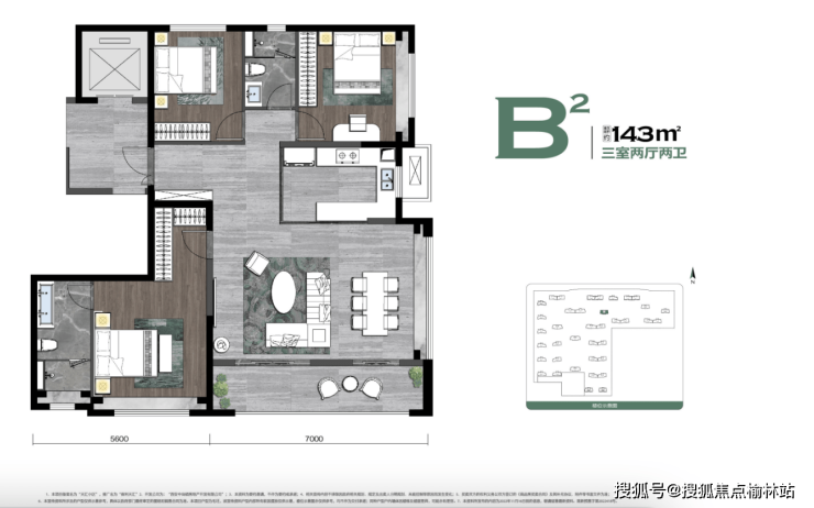 【B2户型】建面约143㎡三室两厅两卫端厅