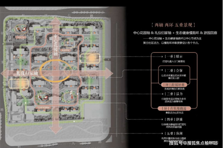自然沉浸场域 游园式奢隐园林采撷学府之韵,遵循生态自然,勾勒两环两轴五境。中心花园+礼仪归家纵横双向景观轴线、生态健康慢跑环+游园环廊双环构架、辅以全龄交互的5重景观园林,互相链接,层层渗透,全境活力共融,礼献一部书苑式美学奢隐样本。