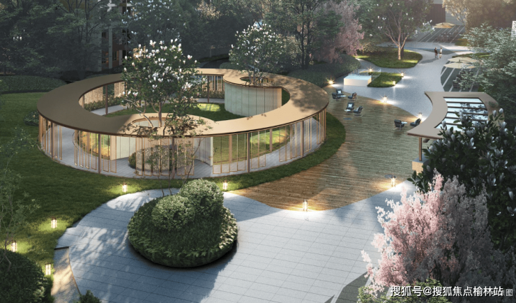 下沉式美学会所 当代文化会客厅以云幕玻璃的艺术化出挑,回应现代主义之璀璨摩登,文化书苑与下沉式庭院场域互联,集萃沐光廊、自然水系、缤纷花境,连接生活与艺术、商务与圈层,缔造当代艺术与人文风尚并存的精神场域。