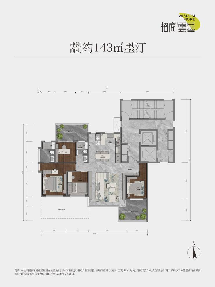 2-4-7-8-9#两梯两户,2#总高22层,4#总高24层,7-8-9#总高26层,建面约143㎡户型