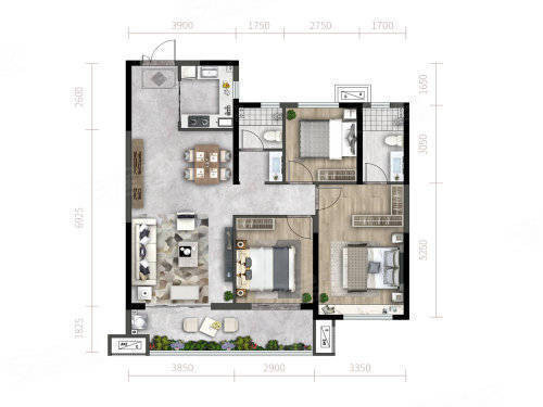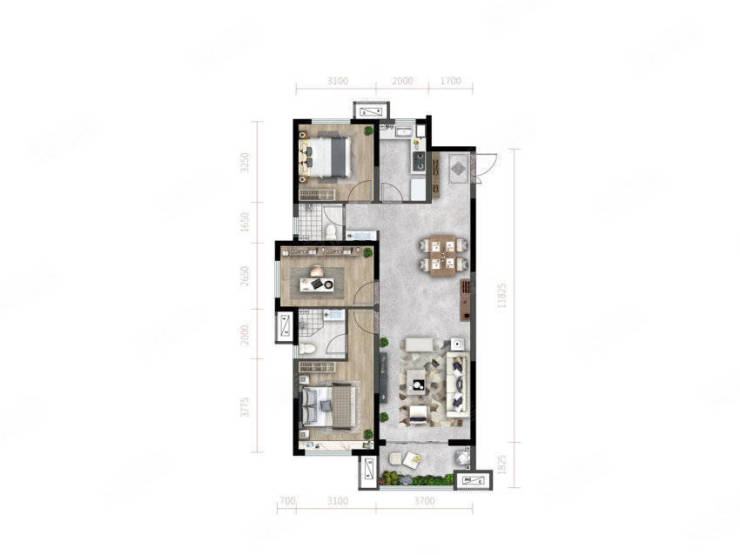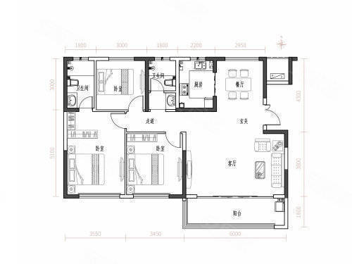 A户型:3室2厅2卫1厨, 建面118.00平米。