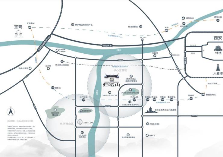 融创管理·归远山,择址太白山核心宜居区,西临汤峪河,北踞渭河,周边生态湿地及公园环绕。西宝高速、关中环线、鄠周眉高速(在建中)等立体路网,1.5小时直达西安主城、西咸/宝鸡双机场,距西法城际铁路(规划中)太白山站约1KM,26分钟畅达西安南。