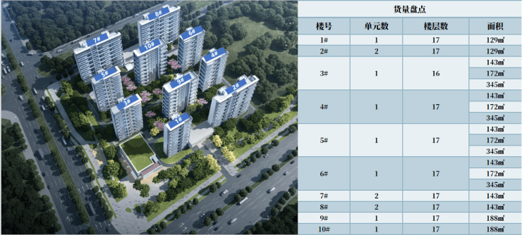 项目总占地42.25亩,总建面约9.98万㎡,容积率2.5,绿地率35%,规划10栋16F/17F小高层产品。车位配比1:2.1,产品面积在128㎡-346㎡,均为毛坯交付。
