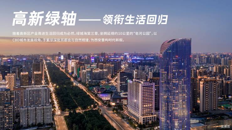 从高新路到唐延路,从锦业路到皂河生态公园,高新区的发展均以城市轴脉为趋势,随着产业南进,新一代高新绿轴(皂河生态公园)成为区域发展的重中之重,领衔高端生活快速回归。