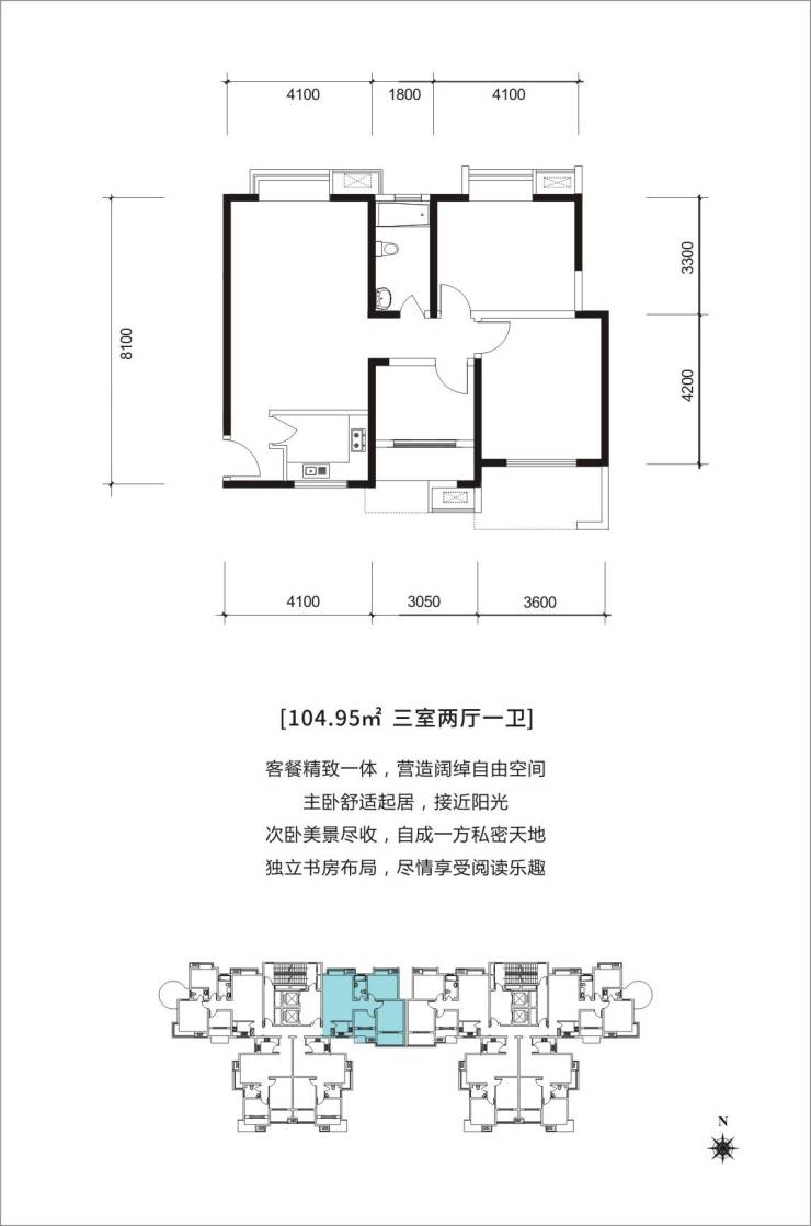 户型2.单套面积:104.95㎡—106.45㎡三室两厅一卫 共计:51套