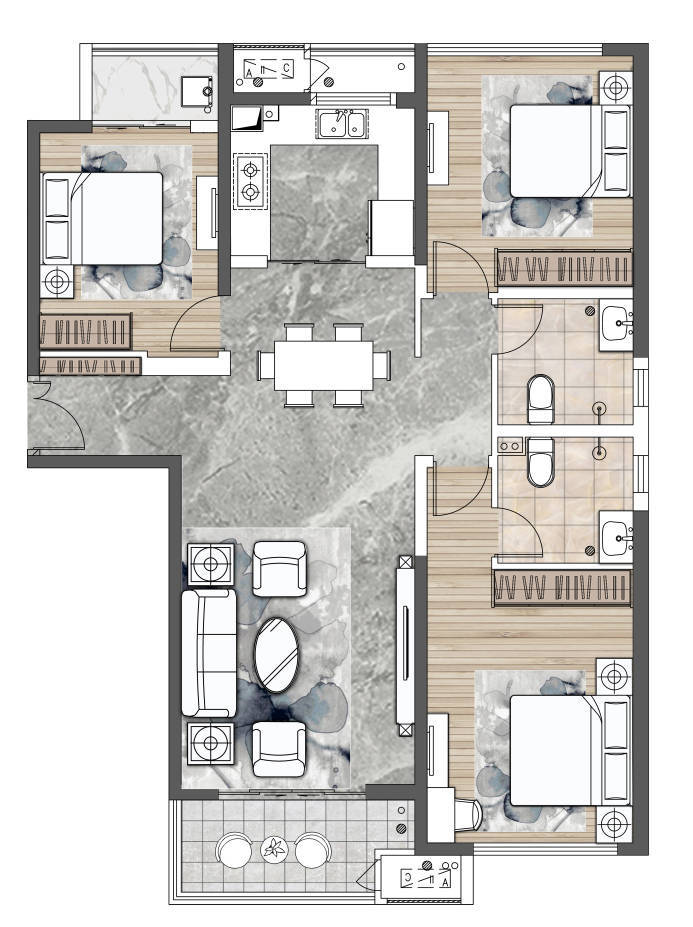 C户型 建面约143㎡ 三室两厅两卫