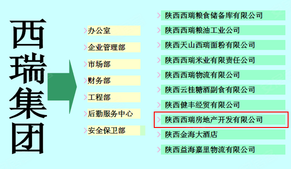陕西西瑞房地产开发有限责任公司,是陕西西瑞(集团)有限责任公司的控股子公司。陕西西瑞(集团)有限责任公司是陕西省粮农集团骨干企业,企业主要以粮食收购、储存、加工、白糖贸易、物流配送、酒店餐饮、房地产开发多领域的大型省属国有控股企业。