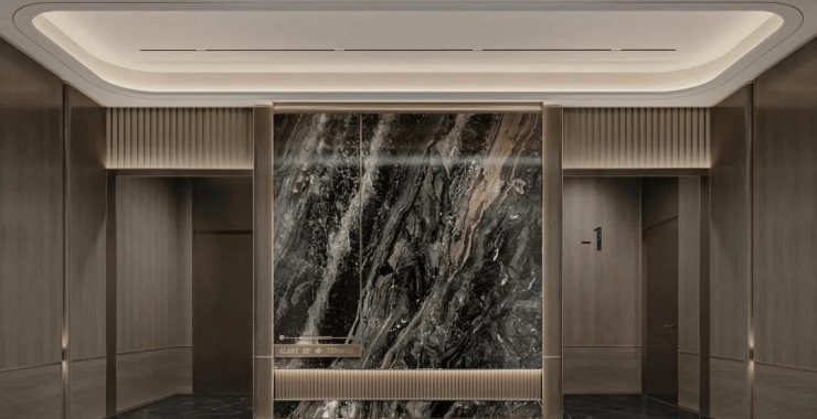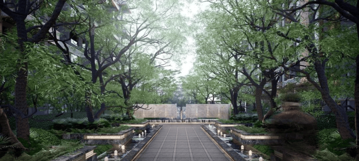 立面采用国际豪宅建筑的精奢风格,致敬顶级珠宝卡地亚的奢华美学,以“直线条和玻璃幕”构建现代美学。