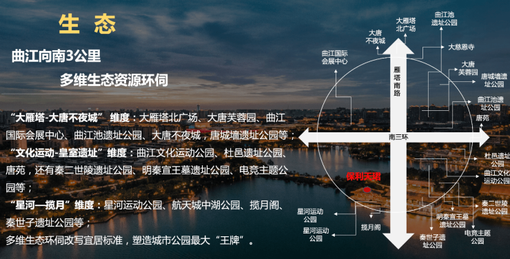 曲江二期:城市运动公园、杜邑遗址公园、唐苑、秦二世陵遗址公园、明秦宣王墓遗址公园、电竞主题公园等。