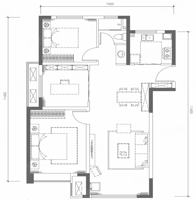 D户型:3室2厅2卫1厨, 建面114.00㎡:
