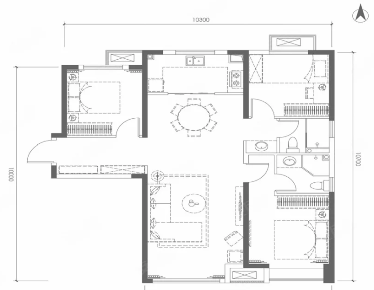 C户型:3室2厅1卫1厨, 建面107.00㎡: