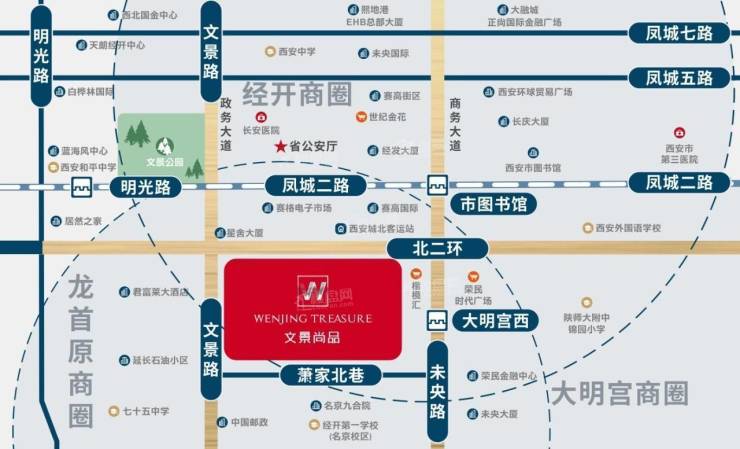 文景尚品位于北二环与文景路交汇东南角,北临北二环,东临未央路,西临文景路,南至萧家北巷,由天元地产开发。项目紧邻北二环,可驾车通达全城,北侧约600米即是西安城北客运站,有稳定的人流量。同时项目约200米内还有33、108、182等多条交通线路便于出行。