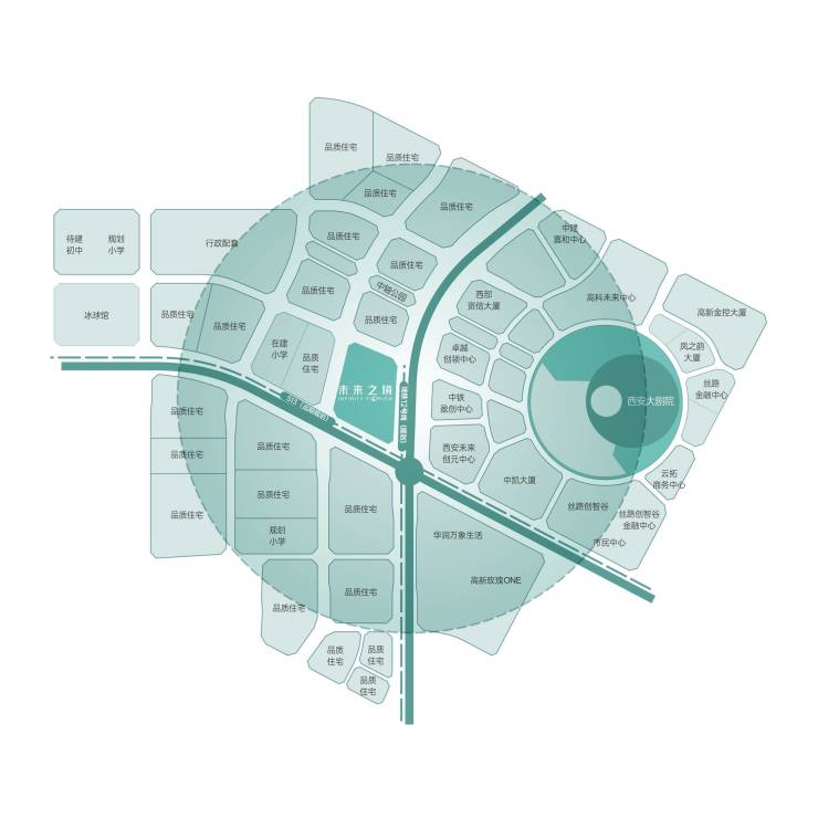 紧临未来之瞳,超级企业总部建筑群,20余栋超百米摩天地标建筑,未来之瞳大剧院、歌剧厅、音乐厅、实验剧场等;
