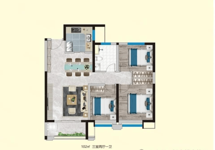 102平米,三室(可变三室)两厅一卫,户型全明设计,动静分区,设计方正无面积浪费,大面宽设计、采光通风良好,三面朝南的功能布局让空间利用率达到最大化,功能齐全,高性价比,低总价!