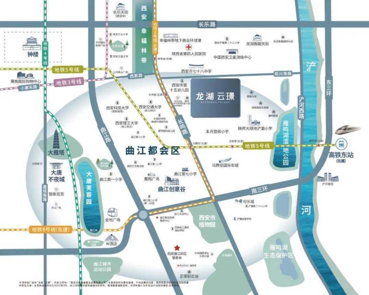 2大地铁:项目所处的是东三环以西、曲江QCIC以东的黄金区域,实实在在的三环内主城定位,外加地铁8号线和5号线双地铁交汇,无论是去曲江、高新还是经开、城西,纵贯全城,轻松通勤。 交通干道路网交织,且咫尺东/南三环,近邻在建中的西安第一/亚洲最大的西安东站,坐拥建中的西安唯一环线地铁8号线和贯穿西安东西的地铁5号线,全新立体交通网升级。