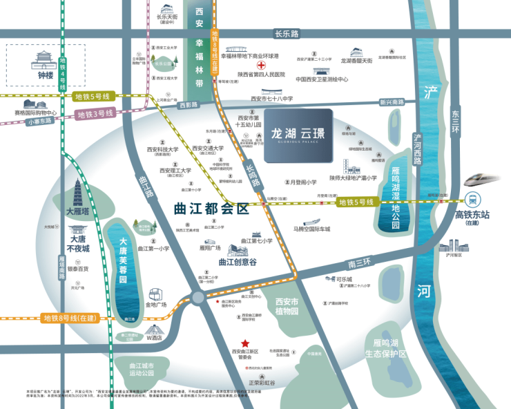 2大地铁:项目所处的是东三环以西、曲江QCIC以东的黄金区域,实实在在的三环内主城定位,外加地铁8号线和5号线双地铁交汇,无论是去曲江、高新还是经开、城西,纵贯全城,轻松通勤。 交通干道路网交织,且咫尺东/南三环,近邻在建中的西安第一/亚洲最大的西安东站,坐拥建中的西安唯一环线地铁8号线和贯穿西安东西的地铁5号线,全新立体交通网升级。