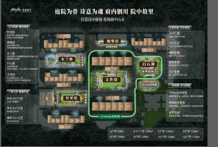 融合中国千年府院文化与当代生活情境,于主城之上定制“辋川故里”院落体系,设置三重入户礼仪大堂、五重归家礼序节点、五大主题院落景观、约520米运动环线、三大复合活动场地,将细小日常容纳进社区场景,让归家成为全家庭的归心。