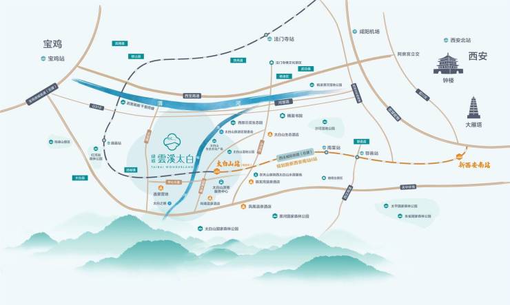 约70km接驳宝鸡,约110km抵达西安,约120km畅达咸阳机场,紧邻关中公共交通枢纽(轻轨站与客运站),近距离已开建西法城际铁路太白山站(规划),轨道建成后将融入西安半小时经济圈。