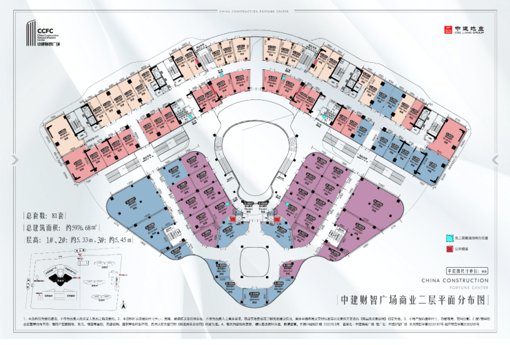 二层总套数:81套二层总建筑面积:约5976.68㎡二层层高:1#、2#:约5.33m,3#:约5.45m