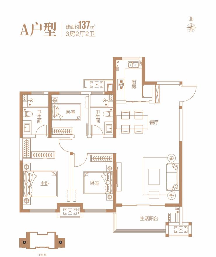 ①高层住宅产品为1-5#楼,总高23-25层,2梯4户,由约105㎡和137㎡的全明三房户型组成;