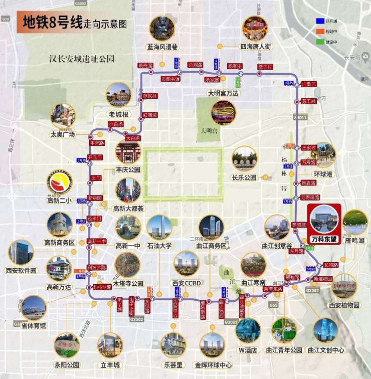 幸福林带、西安植物园、雁鸣湖休闲公园、长乐公园、兴庆宫公园、青龙寺公园环绕,新鲜绿氧常伴,涵养都芯绿肺。