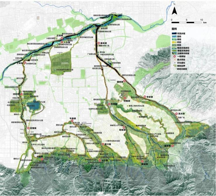 灞河河谷湿地生态公园景观带:构建大水大绿、大开大合、蓝绿交织、舒朗开阔的大型公园游憩空间。
