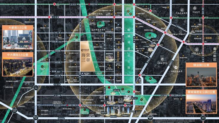 从高新路到唐延路,从锦业路到皂河生态公园,高新区的发展均以城市轴脉为趋势,随着产业南进,新一代高新绿轴(皂河生态公园)成为区域发展的重中之重,领衔高端生活快速回归。