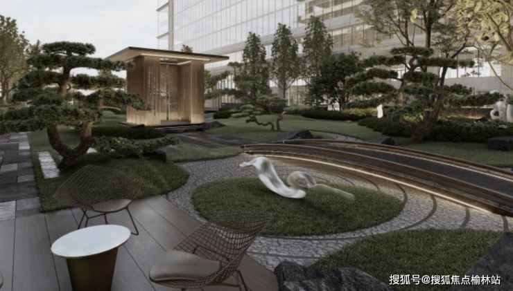 现代东方美学的禅意花园,把现代东方美学融会贯通用植物拟山景,以砾石拟湖景,搭配全景式的玻璃廊架,将四周的景观尽收眼底,营造静谧的会客空间,感受自然景观由内而外的贯穿