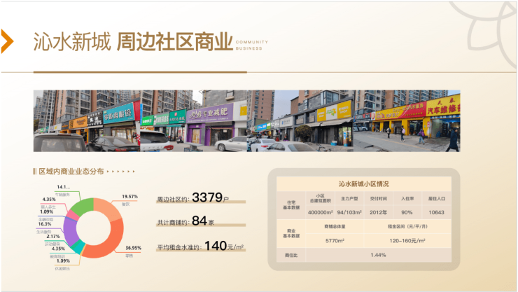 沁水新城周边社区约3379户,商铺84家,平均租金水平140元/㎡