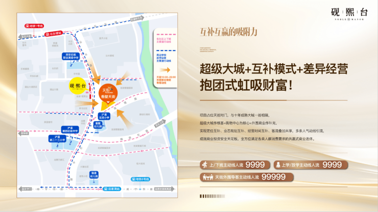 项目占位天街对门,与十年成熟大城一街相隔,超级大城作根基+购物中心为核心+外围商业作补充,实现定位互补,业态规划互补,经营时间互补,客流叠加共享,多条人气动线引流,成就商业投资安全天花板,全方位满足各类人群消费需求的共赢式商业连体。