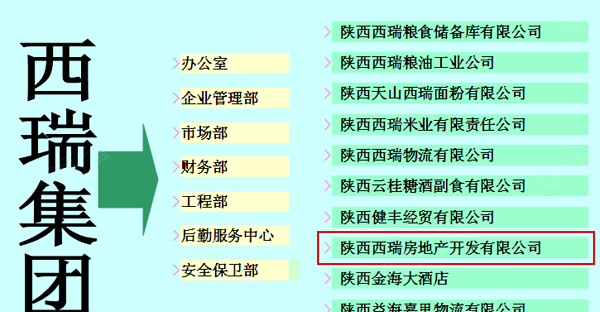陕西西瑞房地产开发有限责任公司,是陕西西瑞(集团)有限责任公司的控股子公司。陕西西瑞(集团)有限责任公司是陕西省粮农集团骨干企业,企业主要以粮食收购、储存、加工、粮油贸易为主业,涉足期货交割、白糖贸易、物流配送、酒店餐饮、房地产开发多领域的大型省属国有控股企业。