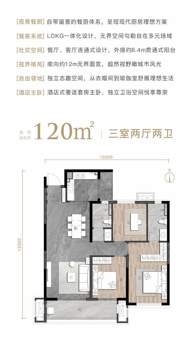 局、南向极值面宽、贯通式阳台、LDKG家庭社交区、阔尺套房式主卧等,表达高品质生活格调。