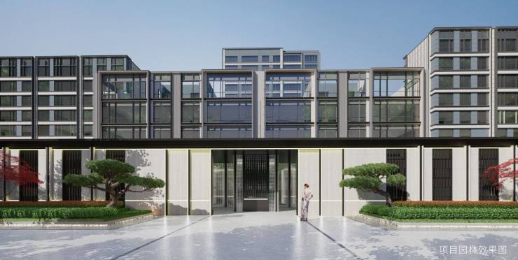 【星空画幕】入口采用树阵的方式强调仪式感,同时将入口门楼遮掩其中,制造若隐若现的神秘感。纯净的镜面影池居中而卧,建筑、林木倒影呈现于此,和镜池形成无声的互动,营造更加舒心安全的社区氛围。