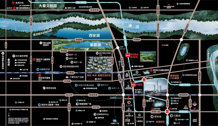 一河:项目正北1公里即是渭河生态湿地公园,驱车五分钟即可抵达,作为“八水润长安”最有名的河流,对于西安这座古城意义非凡。