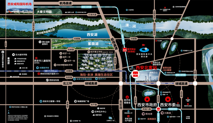 拥有整个城北最为便捷的交通网络,毗邻亚洲最大的高铁枢纽站、咸阳国际机场、机场高速公路、绕城高速,南北向联通朱宏路与北辰路两座超高效率的快速干道,东西向尚稷路快速通达沣东,高铁新城,国港浐灞生态区,地铁19号线 “长安大学北校区”站,无论您是开车出门,还是家人选择公共交通出行,相信西安再无一处可与此媲美。西安北站随着更多线路的开通,国家高铁交通枢纽的北客站版块,其价值也将被进一步提升。