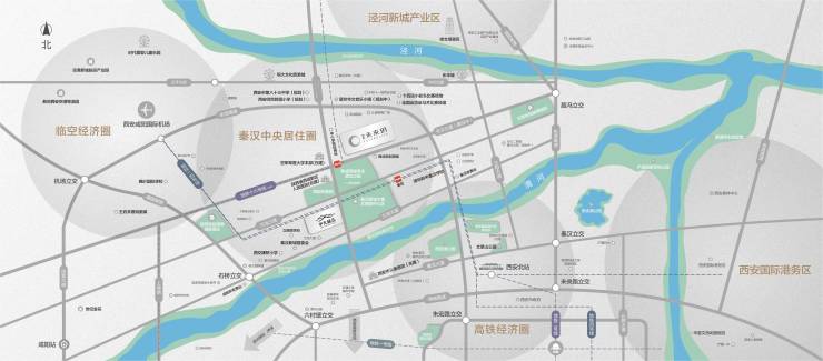 轻轨(规划中)泾渭大道、汉高大道、天汉大道多条主干道纵横